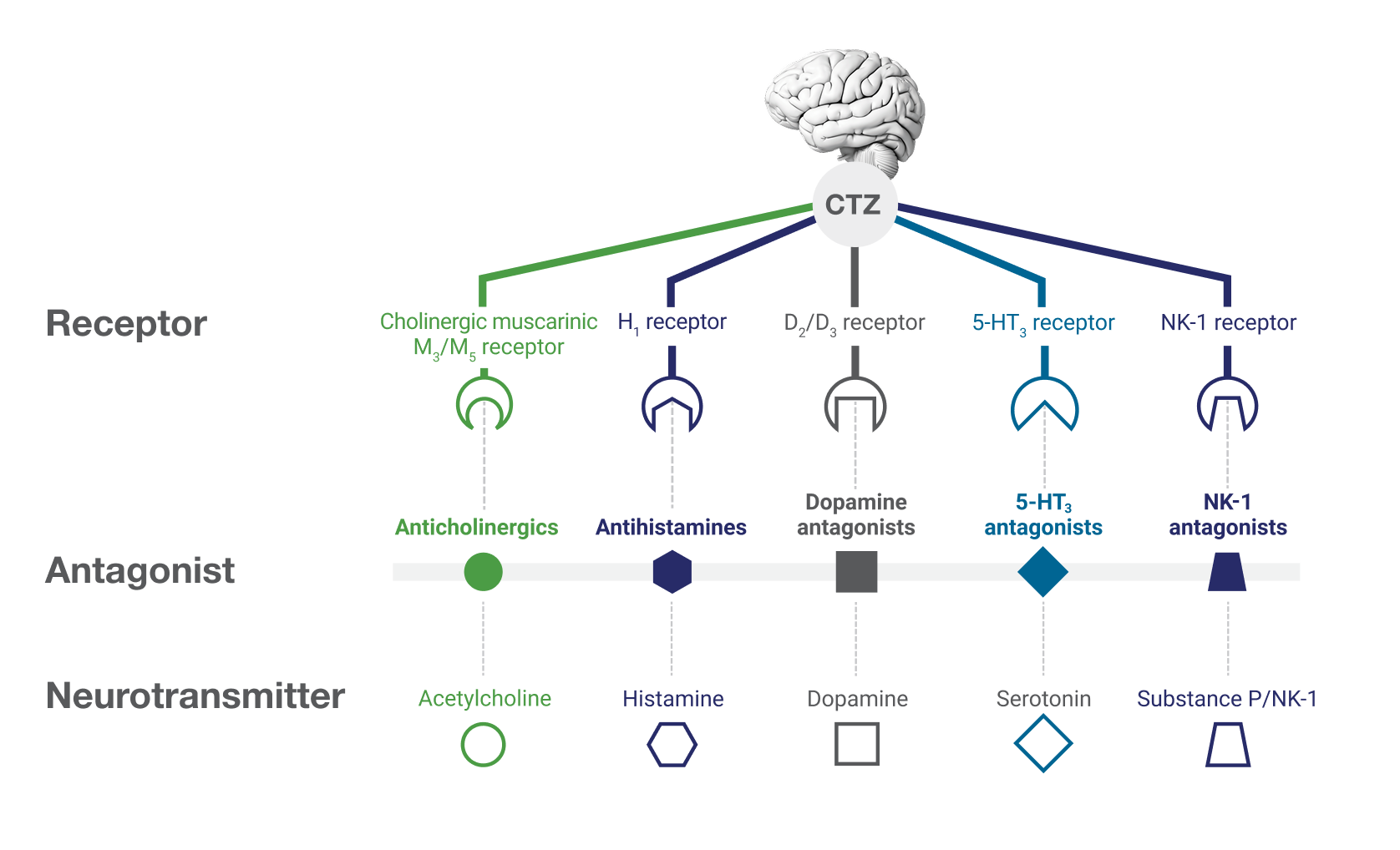 Multiple neurotransmitters and their receptors (eg, D2/D3, 5-HT3, M3/M5) can induce nausea and vomiting.11,12